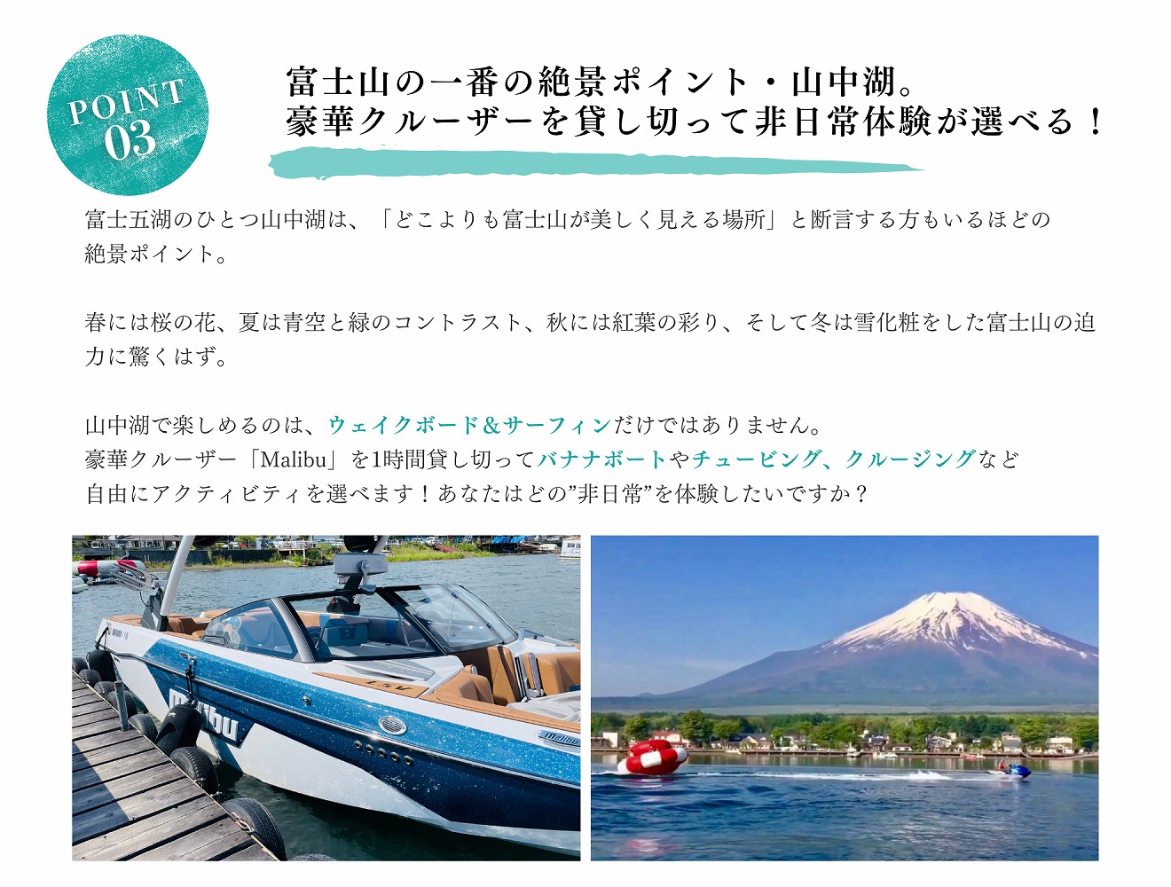 【山中湖】豪華クルーザーを貸し切ってウェイクサーフィンやウェイクボード、クルージングetc.を楽しむ!