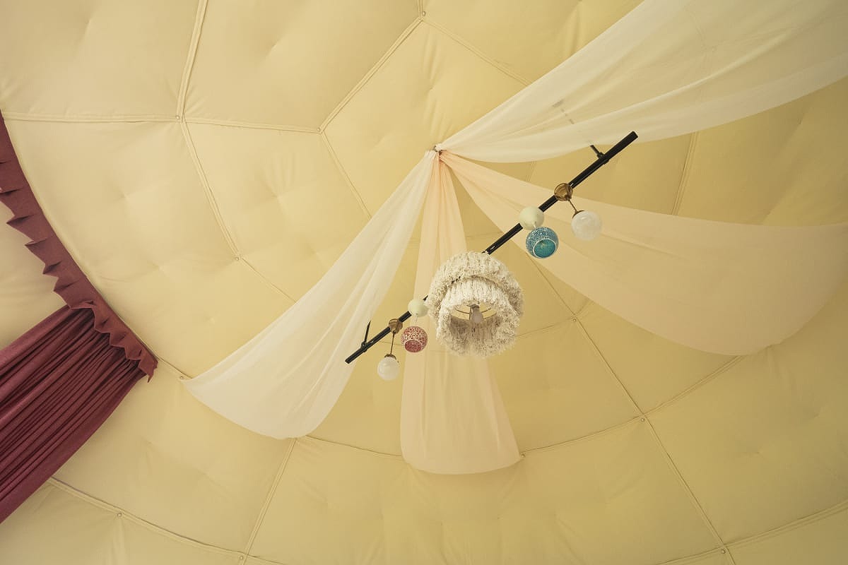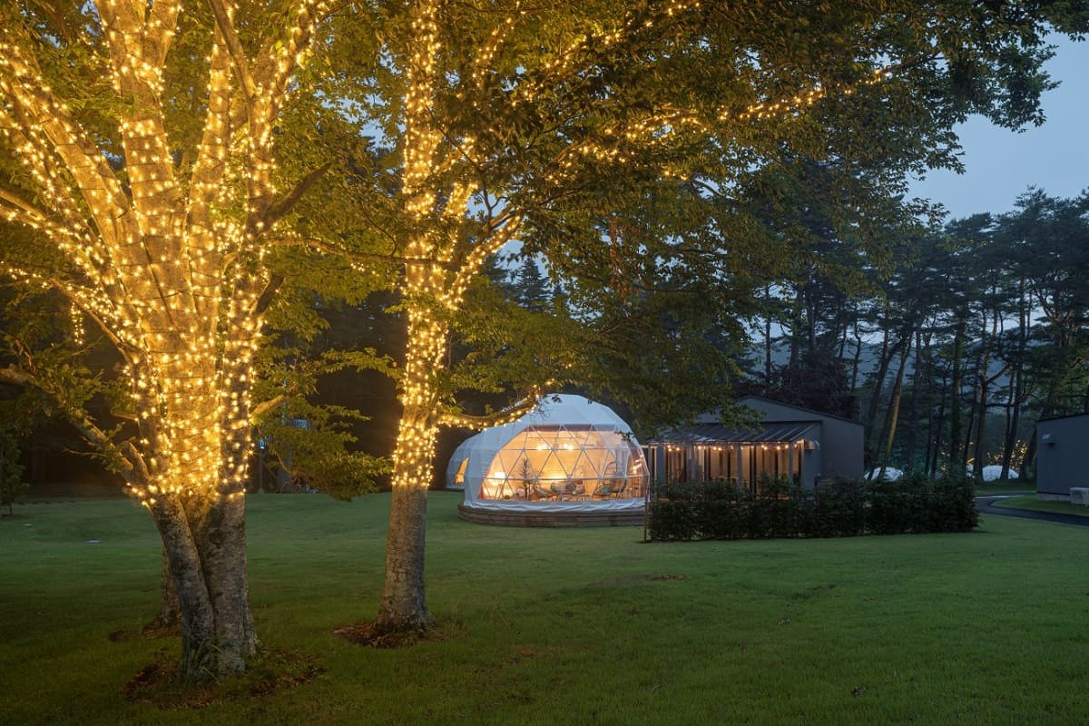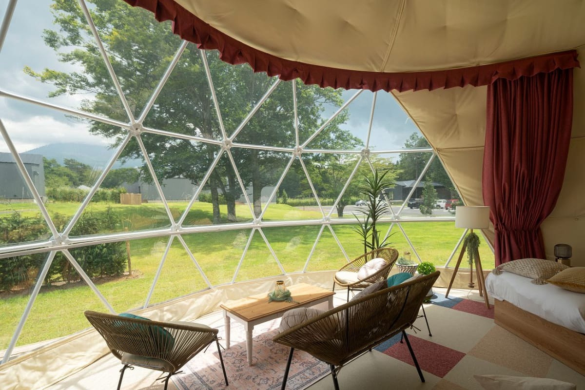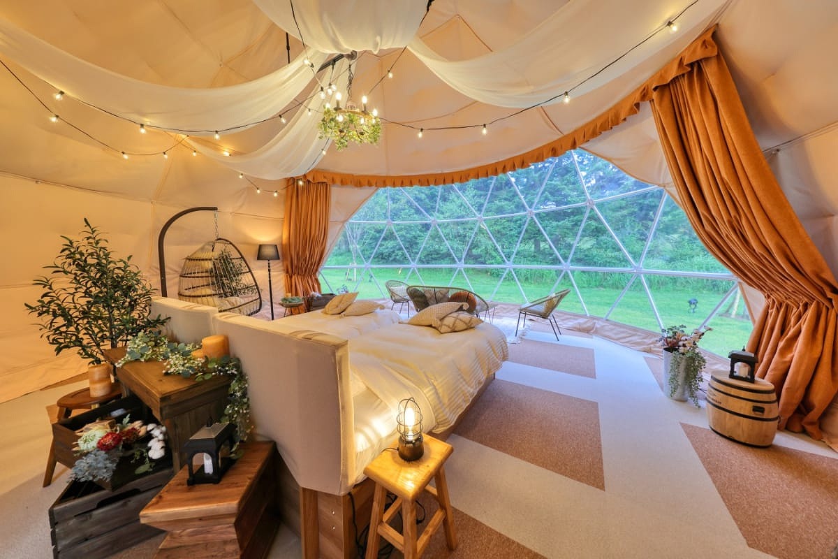 プライベートガーデンスペースを備えた、直径7mのドーム型グランピングタイプ。
