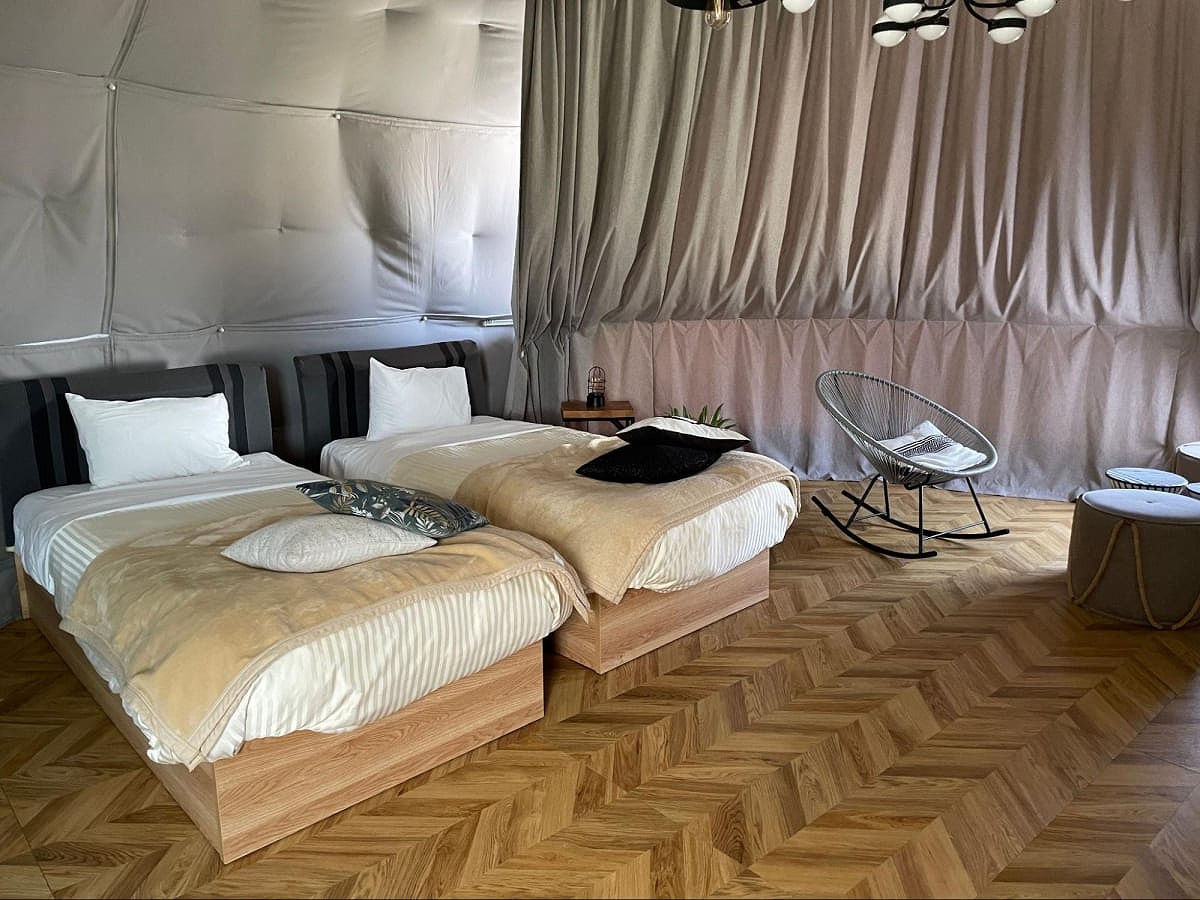 ドーム型テント内にはシングルベッド2台配置し、マットレスを使用すれば最大5名まで宿泊可能です。自然を楽しむプライベート空間でのアウトドア体験をお楽しみください。