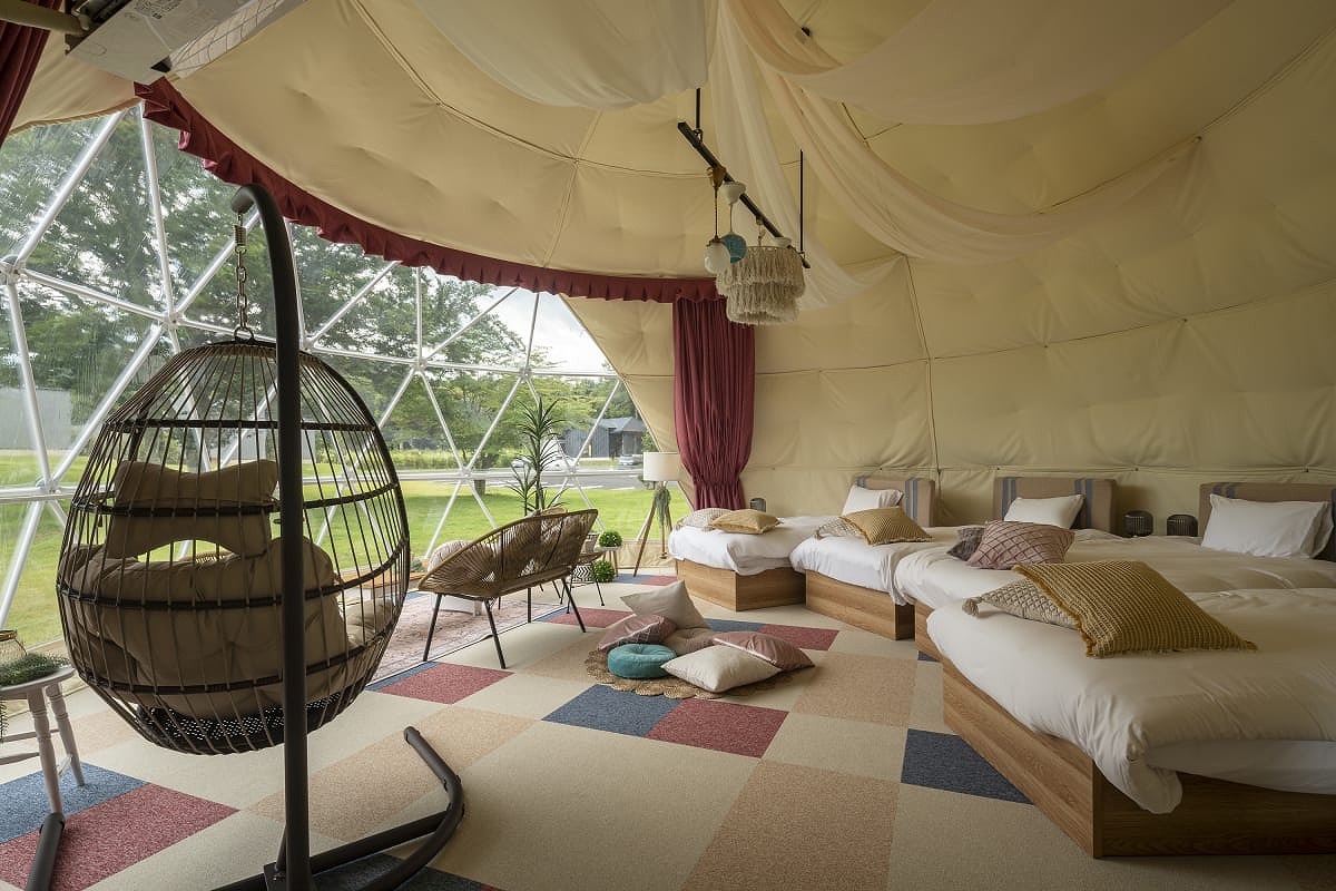 人気のドーム型テント内にはシングルベッドを4台配置し、マットレスを使用すれば最大5名まで宿泊可能です。自然とひとつになるような空間でのアウトドア体験をお楽しみください。