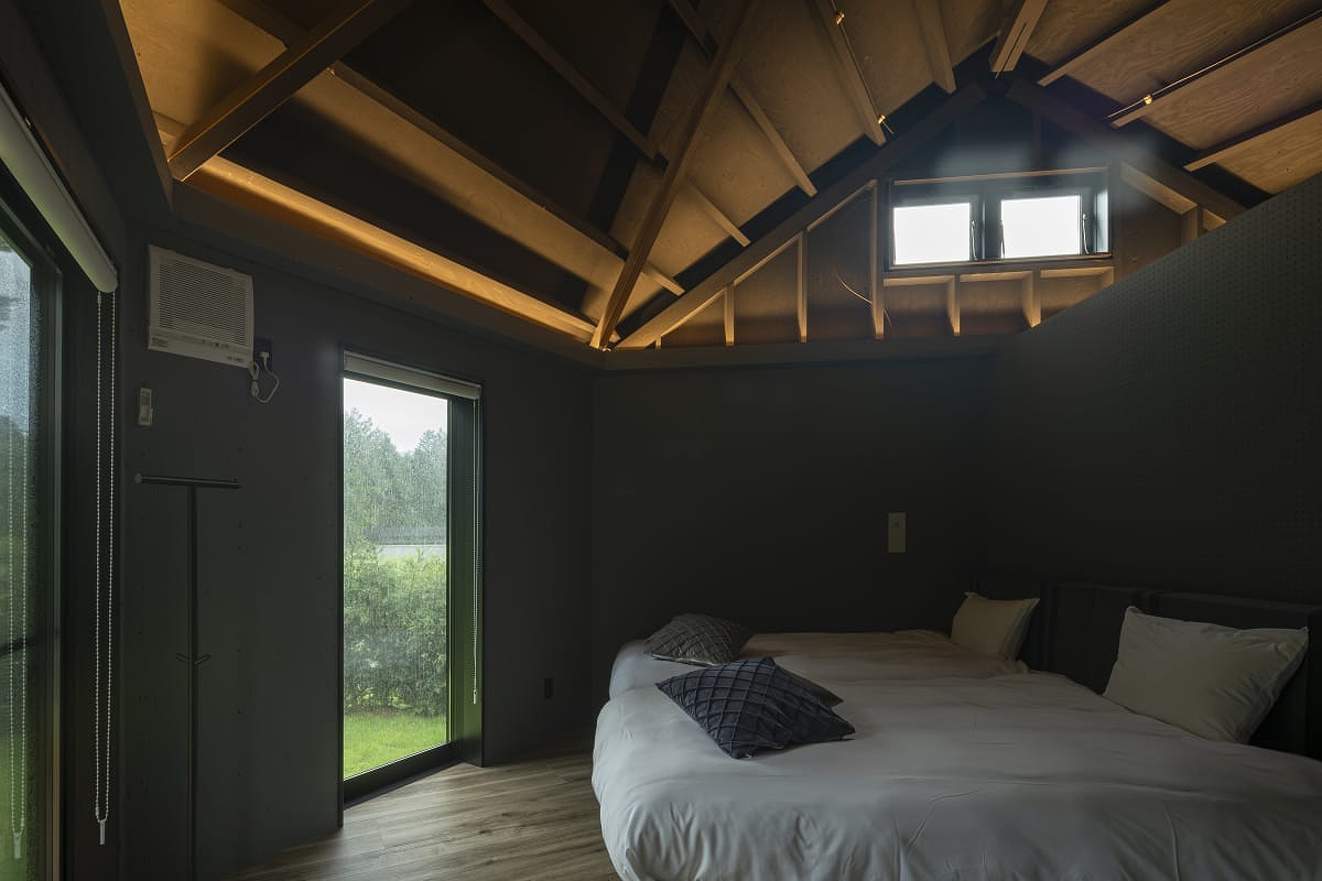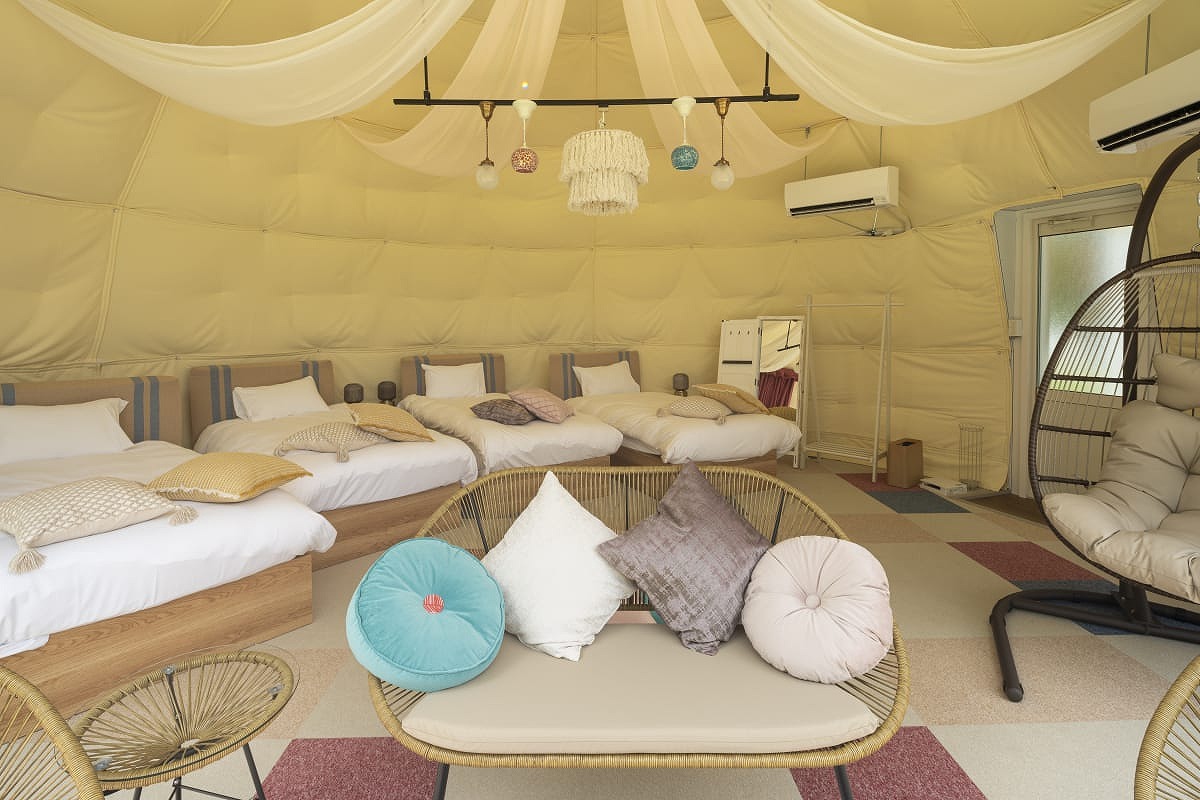 人気のドーム型テント内にはシングルベッドを2台配置し、マットレスを使用すれば最大5名まで宿泊可能です。
